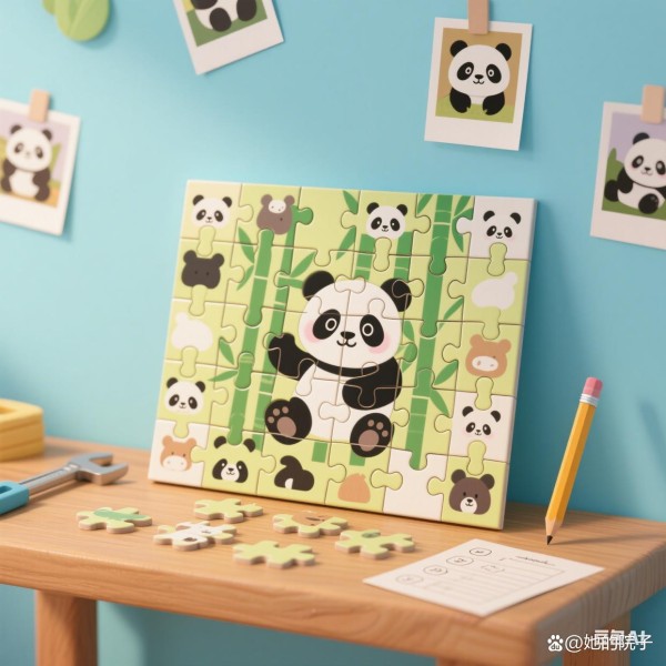 硬纸板裁切的动物拼图藏着巧妙设计:熊猫拼图隐藏竹子图案,拼正确才能显现完整画面。从12片到24片逐步增加难度,培养空间思维的同时,更能锻炼孩子的抗挫折能力。