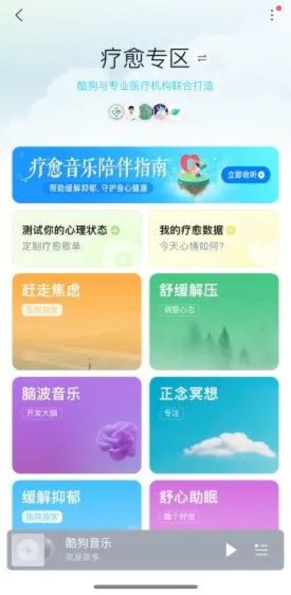 酷狗音乐还创新性地引入了专业医疗机构,与医院和专业心理咨询师共同打造“疗愈专区”,达到情绪“私人定制”,可谓是一招妙手。
