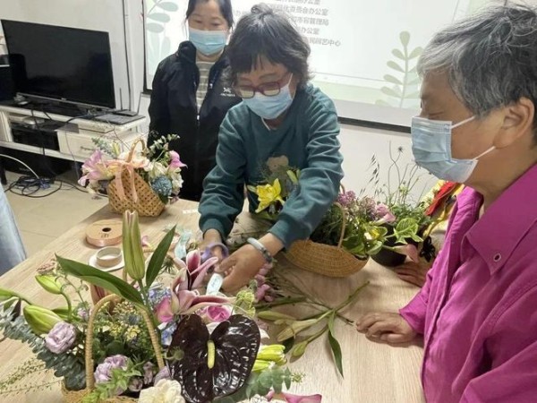 听完老师的讲解,居民们就开始自己动手切花和插花,看着眼前摆满的多肉、覆盆子、尤加利和绣球等,大家纷纷向老师求助,老师走到居民们身边开始了一对一教学。由于器皿是花篮,老师推荐以扇式作为基础造型,扇式是由三角式插花造型变化而来,在中心的位置呈现的是一种放射状,然后构成的扇面形状。老师告诉居民,插花的基础造型还有很多,像水平式、椭圆式、三角式等,造型多样,变化繁复,但却万变不离其宗,只要能熟知了插花艺术的造型内涵,新式造型会层出不穷地冒出来。 不一会儿,大家陆续完成了插花作 品,看着自己手中的作品,居民们都露出了满意的笑容。