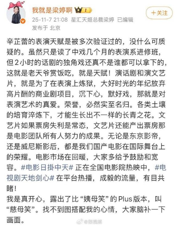 梁婷在发文中毫不吝啬对辛芷蕾的赞赏,直言这就是“老天爷赏饭吃”。她特别指出,辛芷蕾虽然只在中戏读了几个月的进修班,却能拿下长达两小时的话剧独角戏——“这还真不是谁都可以做到的”。在梁婷看来,辛芷蕾在“大好时光的年纪”主动放弃高片酬的商业剧,选择通过话剧和文艺片来“炼狱”般打磨自己,恰恰证明了她对表演艺术的“真爱”。