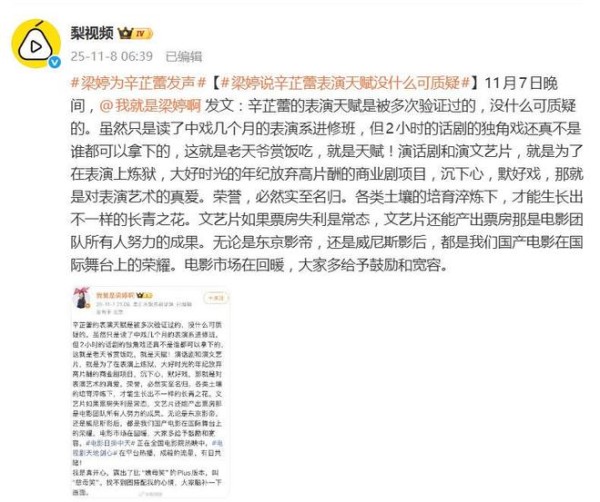 梁婷为辛芷蕾发声:辛芷蕾的表演天赋,没什么可质疑的