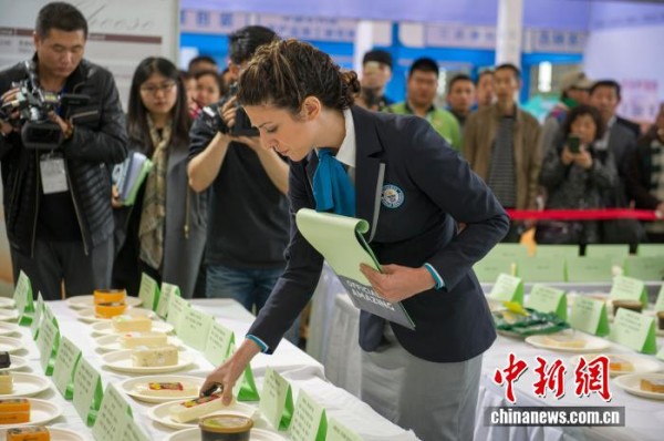 2016年4月23日,哈尔滨最大规模奶酪品种展示挑战吉尼斯世界纪录成功。图为吉尼斯世界纪录认证官现场核对奶酪展品。中新社记者 于琨 摄