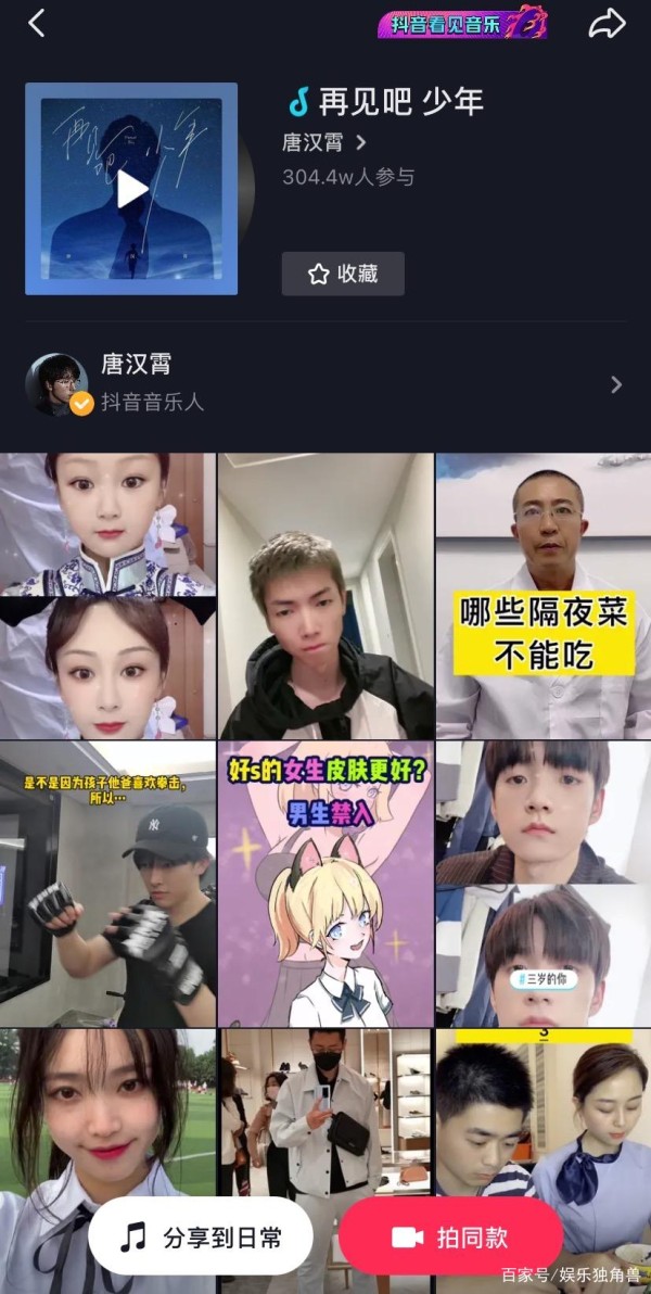 作为「2021抖音看见音乐计划」的参赛音乐人,唐汉霄以唱作人身份发布新歌《再见吧 少年》迅速获得超过304万次使用,这一串数字代表庞大受众群的目光和认可。经过两个月的激烈角逐,最终在「2021抖音看见音乐计划」中拔得头筹。
