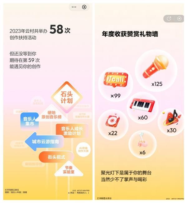 同时,在「赞赏」板块,随着这一功能在「云梯计划2023」中的更新升级,今年的音乐人年度报告也详细展示了音乐人收到的赞赏礼物类别和数量,让每一份心意传达的温暖都能准确触达。