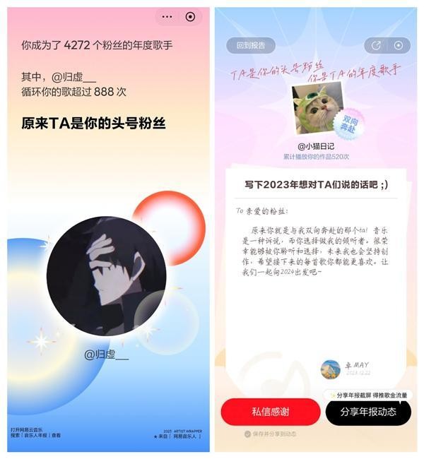 同时,今年的音乐人年度报告也在这一板块埋藏了惊喜彩蛋。音乐人除了能看到自己这一年度的“头号粉丝”和“亲密粉丝”并为他们写下感谢信之外,如果自己恰好也是该粉丝的“年度音乐人”,双方则能实现真正的“双向奔赴”,成为对方在音乐上的知己。