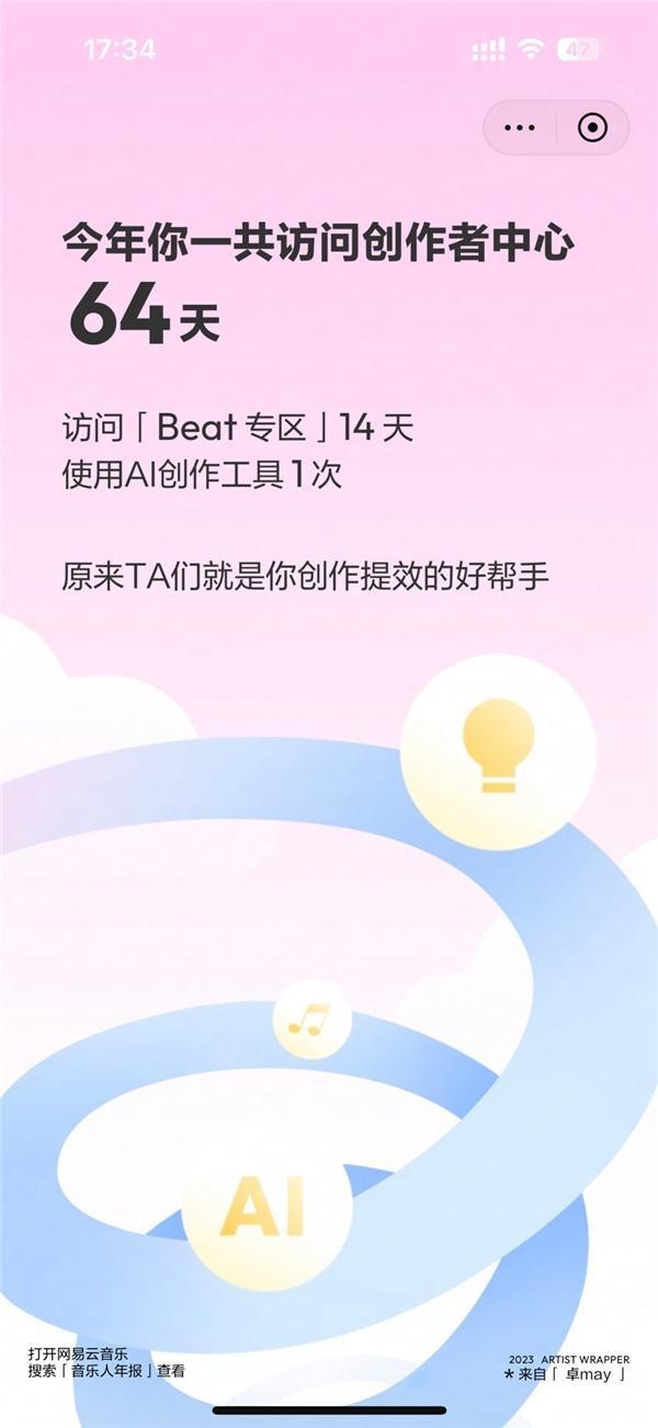 更全面展现音乐人平台身份数据及平台收益信息。延续了往年音乐人年度报告的亮点部分,今年的音乐人年度报告持续丰富了过往一年音乐人群体在网易云音乐平台的活动信息,进一步优化了音乐人回顾过往一年创作历程的体验。
