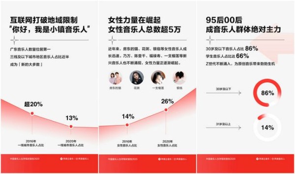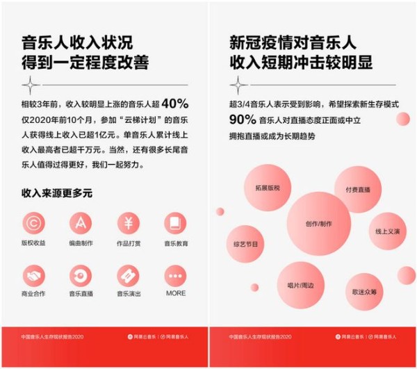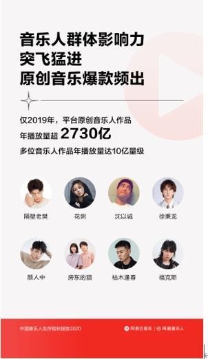 11月6日,网易云音乐发布《中国音乐人生存现状报告(2020)》。《报告》数据显示:近年来中国原创音乐取得重大发展,已渐与主流商业音乐并驾齐驱。音乐人生存现状有较明显改善,同时仍有较大发展空间。其中,网易云音乐入驻音乐人超20万,较4年前增长10倍。音乐人群体迅速壮大给原创音乐提供了至关重要的生力军,也给整个华语音乐产业带来全新机遇与命题。