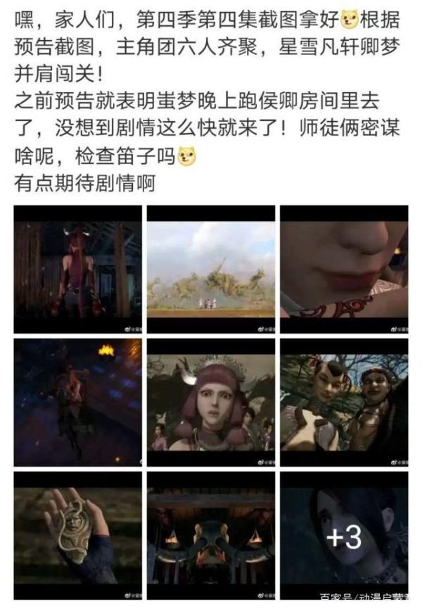 最近,有网友在“画江湖之不良人”贴吧分享了海外版的《画江湖之不良人》第四季动漫。由于国外的限制比较少,在国外的不良人动漫已经更新到了第四集,第三集似乎是李星云、张子凡和筱翁达成合作,主角成功拿到了避毒珠,而第四集则主要讲述,李星云等人前往被瘴气笼罩的万毒窟,准备营救蚩梦的父亲--蛊王。不过,在李星云出发之前,行迹漂泊不定的尸祖侯卿突然出现,他将加入李星云的团队,一起去往万毒窟。如此一来,主角团总算是凑齐了,李星云牵着姬如雪,张子凡拉着陆林轩,侯卿小心翼翼地照顾蚩梦,就这样前往万毒窟。