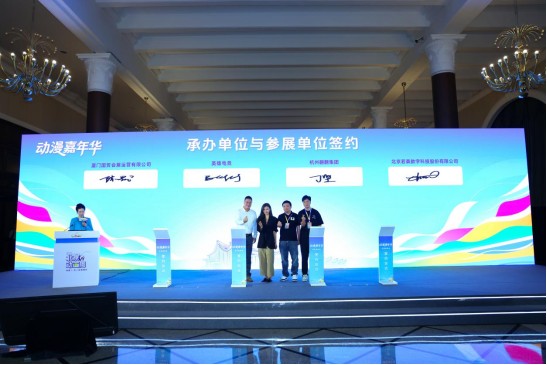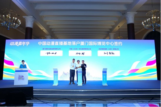 在随后的签约环节,动漫嘉年华承办单位厦门国贸会展运营有限公司与中漫(北京)文化发展有限公司进行了动漫直播基地合作签约,与英雄电竞、杭州翻翻集团、北京若森数字科技股份有限公司等参展企业代表进行了合作签约,这系列举措宣布嘉年华招展工作已取得实质性进展,标志着中国动漫直播基地正式落户厦门,为嘉年华注入新的平台资源与内容活力。