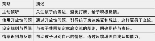 在日常生活中,良好的沟通能有效增进亲子关系。家长可以通过以下策略提升家庭沟通质量: