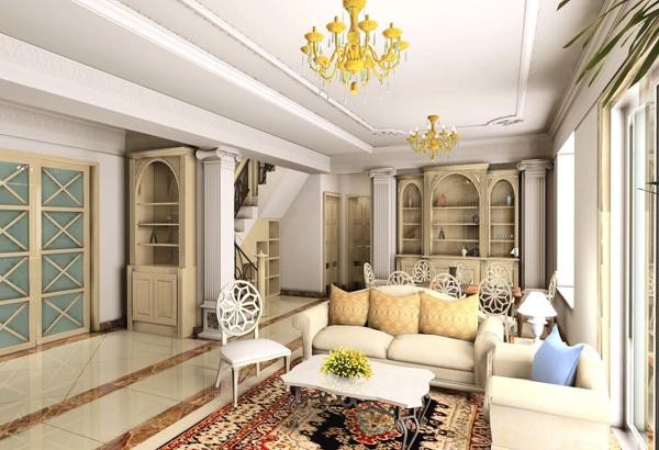 客厅是主人经常会客的地方。客厅的颜色要充分体现主人的特点。如:红、黄、紫等色彩。地面采用黑色、深红等色彩。客厅顶部采用金黄色的灯饰,搭配出华丽的效果。