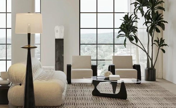 示例:极简风格可搭配绒布沙发、异形玻璃茶几和黑色扶手棉麻单椅,打造优雅高级质感。
