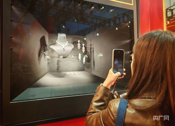 第八届进博会消费品展区内观众在某珠宝展品前驻足拍照欣赏