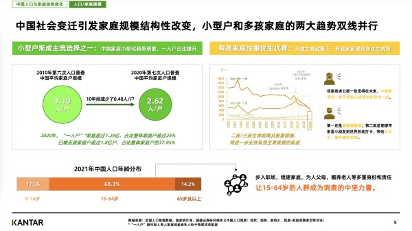 根据人口普查数据显示,十年间的中国家庭每百户减少了48人,一人户占比提升,中国家庭小型化趋势明显。与此同时,随着国家开放二胎/三胎生育政策,并出台配套政策来进一步支持强意愿生育家庭,中国家庭结构呈现小型户与多孩家庭的趋势双线并行。