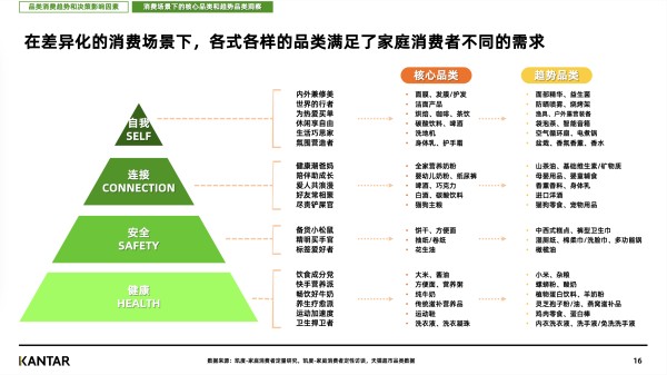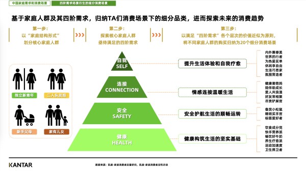 结合生活理念与方式的变化,报告拆解形成“健康、安全、连接、自我”家庭四阶需求场景金字塔,健康构筑美好生活的坚实基础,安全护航美好生活的顺畅运转,情感连接温暖生活,提升生活体验和自我疗愈关注自我价值实现。围绕“四阶需求”,报告将不同家庭人群的购买归纳为20个细分场景。