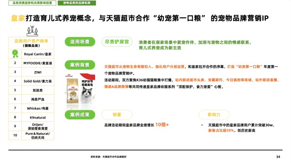 天猫超市从宠物生命周期切入,与皇家合作“幼宠第一口粮”的宠物品牌营销IP,活动期间,双方聚焦K36幼猫猫粮集中打爆,站内联动超市头条、宝藏期刊、今日疯抢等场域,站外联动直播、猫超&品牌微博,天猫超市中的皇家品牌用户累计突破30w,新客占比超50%,创历史新高。