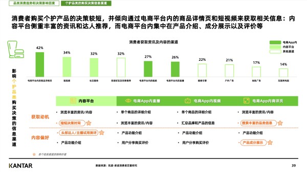 同样是家庭场景的清洁需求,在选择个护产品时,消费者则更加倚重实际效果和成分特点。独立新青年的主要诉求是控油或滋润的功效,购买则会考虑性价比;而家有儿女人群则对个护产品的天然成分有更高的期待。整体来看,消费者购买个护产品的决策较短,并倾向通过电商平台内的商品详情页和短视频来获取相关信息,内容平台侧重丰富的资讯和达人推荐,而电商平台内集中在产品介绍、成分展示以及评价等。
