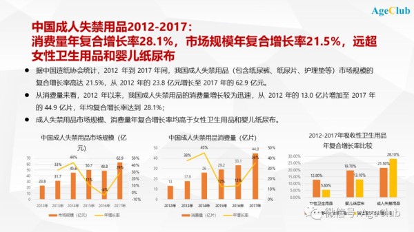 从纸尿裤这个行业案例来看,很能说明问题。根据中国造纸协会的统计,成人失禁用品(包含纸尿裤、纸尿片、护理垫等)在过去几年的高速增长,充分说明了老龄化人口增量带来的市场机会。