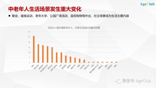 再从AgeClub近期做的北京百位50+高价值新老年人深度调研看,聚会、健身运动、老年大学、公园广场活动、逛街购物等外出、社交场景的活动成为生活主要内容。这个结果其实与我们日常生活所观察感受到的是一致的。
