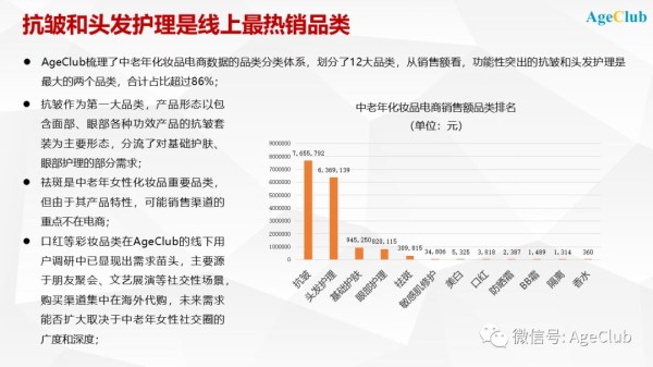 其实线下调研得到的结果和线上电商数据有一些不一样。在我们6月份发布的中老年化妆品电商报告中曾指出,功能性的化妆品品类是线上销售的主流,在数据覆盖的销售额中,抗皱和头发护理两大品类占比达到86%。