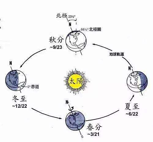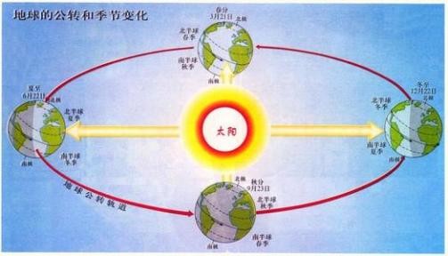 在现代天文学上,季节的划分是以地球围绕太阳公转轨道上的位置来确定的。地球的公转,是地球围绕太阳的旋转,它公转的路线叫轨道。虽然四季的变化与地球公转有关,但决定性的条件是地球必须斜着绕太阳转,也就是黄赤交角的存在。如果没有黄赤交角,地球绕太阳垂直旋转,太阳光将永远直射在地球的赤道附近,而其他地方的太阳光线与地平面之间的夹角也是永远不变,地球上便不会有四季的变化。 [11]黄赤交角是地球公转轨道面(黄道面)与赤道面(天赤道面)的交角,也称为太阳赤纬角或黄赤大距,位于23°26'。黄赤交角具有重要的天文和地理意义,它是地球上四季变化和五带区分的根本原因。由于黄赤交角的存在,造成太阳直射点在地球南北纬23°26′之间往返移动的周年变化,从而引起正午太阳高度的季节变化和昼夜长短的季节变化,造成了各地获得太阳能量多少的季节变化,于是形成四季的更替。 [12]