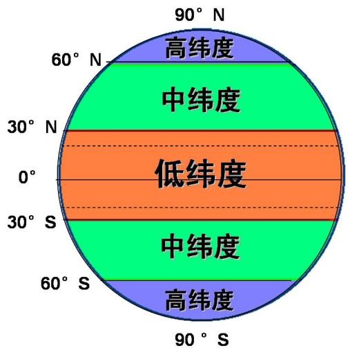 中国地域宽广,位于低、中、高纬度。低纬度一般是指地球表面南北纬度30度间的空间范围,即30°N至30°S以内地区,包括热带、副热带两个热量带,是全球太阳辐射和热量比较集中的地带。中纬度是指南北纬30度-60度之间的纬度带,高、低纬度的盛行气团在这一带相互交迭,气旋活动频繁,气温变化明显。高纬度是指地球表面南北纬度60度到南北极之间的区域,是地球表面接受太阳辐射最弱的地带。中国南方地区(低纬地区),降水丰沛、光照充足、湿润、冬夏温差较小,季节转换时日照、降水等气候要素变化明显。北方地区(中纬地区)降水少、干燥、冬夏温差悬殊,季节转换时气候要素变化明显的是气温。 [4] [9] [14]