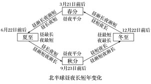(2)昼变长夜变短不等于昼长夜短,如北半球昼变长说明太阳直射点向北移动,但太阳可能直射南半球,此时北半球昼短夜长。昼变短夜变长与昼短夜长亦是同样道理。