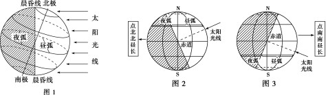 (4)图1—图2—图3,全球昼夜长短的变化规律:北半球白昼逐渐变长,由最短变为最长,黑夜逐渐变短,由最长变为最短;南半球相反。