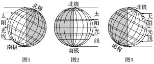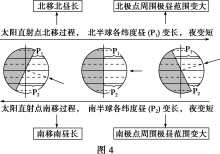 (2)太阳直射点向北移动,北极点周围极昼范围变大;太阳直射点向南移动,南极点周围极昼范围变大。(如图4所示)