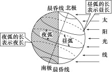 晨昏线把经过的纬线圈分割成昼弧与夜弧,所求地所在的纬线圈上,若昼弧长于夜弧,则昼长夜短;反之则昼短夜长。赤道上全年昼夜等长。(如图1所示)