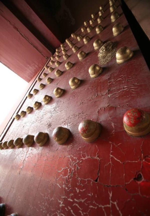 门大了,自然要用板子拼出来,慢慢的就出现了门钉。到了清朝门钉早已变成了装饰品或级别的证明。门钉为铜制,故宫是皇家最高等级,每扇门横纵各九列,共九九八十一颗门钉。只有东华门例外,东华门俗称“阴门”或“鬼门”(走棺材的),所以门钉用“阴数”,就是偶数,所以是纵九横八,共七十二颗门钉。