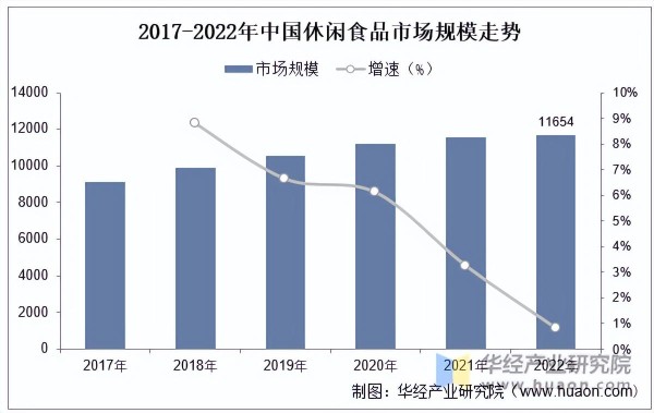 受居民可支配收入增长、城镇化进程持续推进、消费场景日益丰富、现有产品持续升级及新产品推出、销售渠道不断改善等因素的推动,2022年中国休闲食品行业市场规模为11654亿元,2017年至2022年年均复合增长率为5.07%。预计2021-2026年中国休闲食品行业市场规模将以6.8%的年均复合增长率增长,2026年将达到11472亿元。