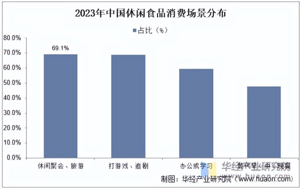 中国休闲食品消费者消费场景通常为休闲聚会、旅游等活动时(69.1%)和打游戏、追剧等休闲时(68.8%),其次为办公或学习时(59.6%)和替代早、中、晚餐(47.7%)。休闲食品消费者消费场景多样化,在不同场景下对于产品的种类、规格及包装等存在不同的需求。