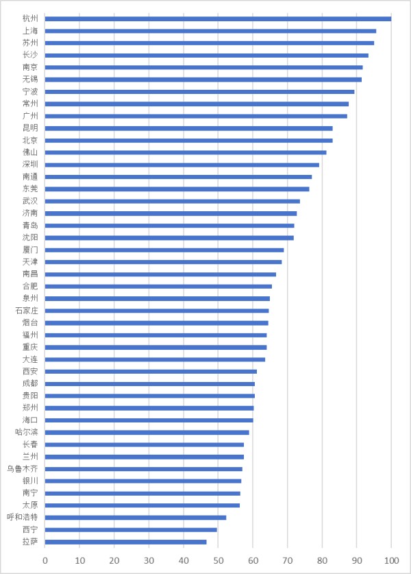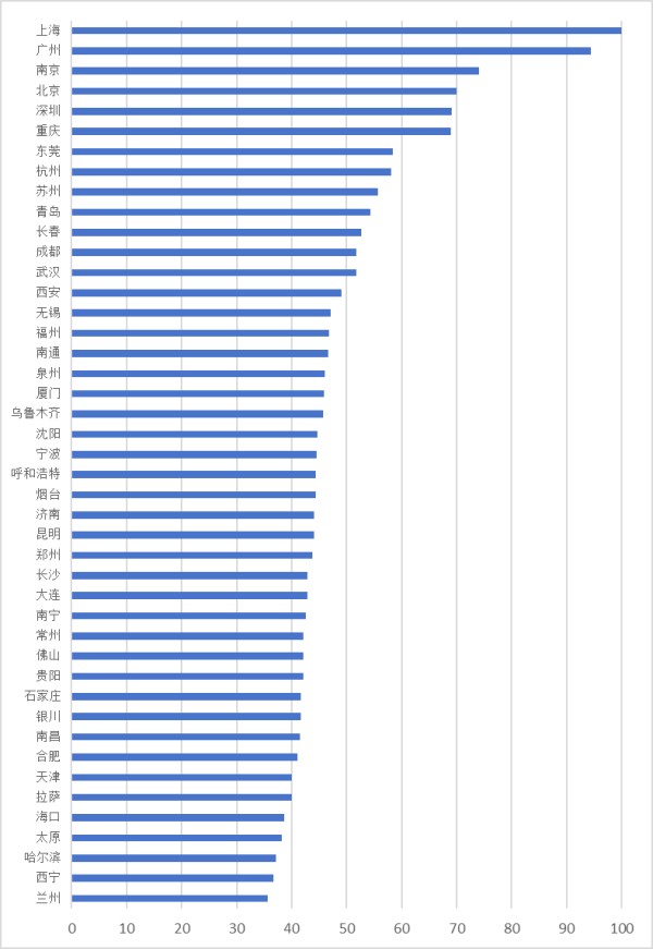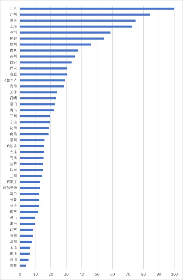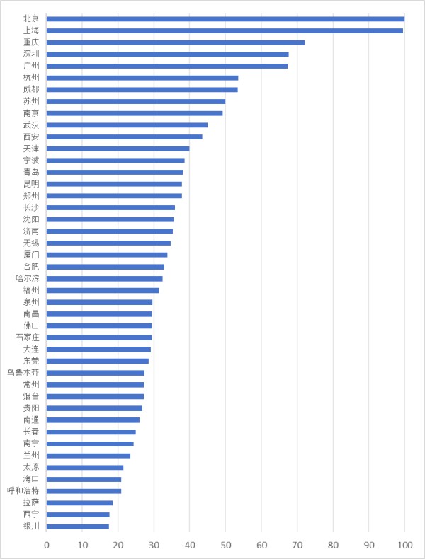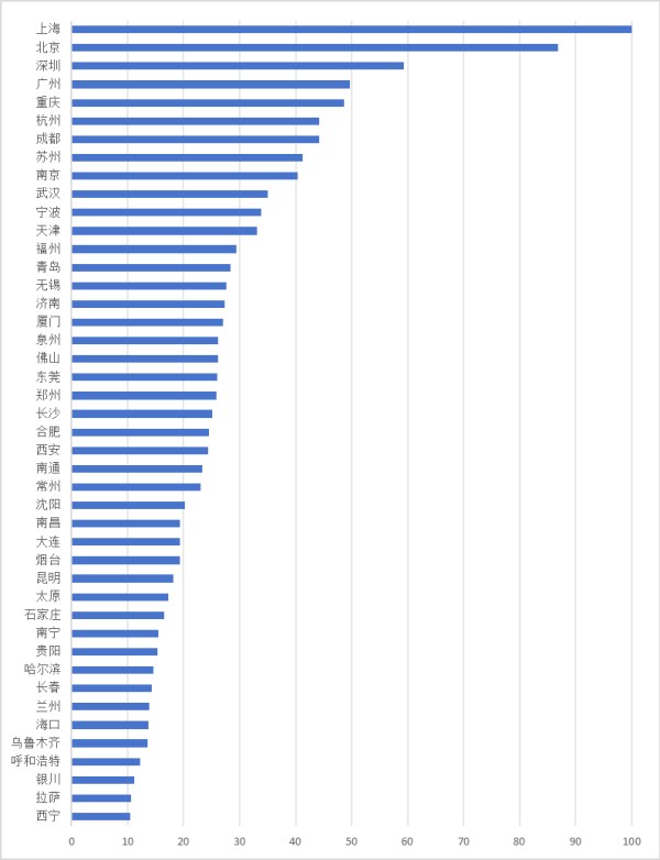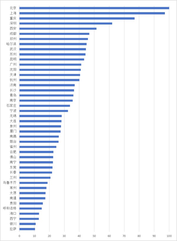 根据相关数据的统计与分析,北京、上海、重庆、深圳和广州排名前5位。杭州、成都、苏州、南京和武汉位居6-10位。需要指出的是,苏州是此次新增加的8个城市中唯一进入前十的城市。银川、西宁和拉萨则位列最后3位。