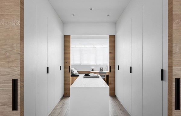 简化繁琐的装饰元素,以线条来作为衣柜主题的勾勒,让美感与收纳机能得以兼具。兼具睡眠区、更衣区及瑜珈室,利落线条及干净立面,铺述出空间最简练的韵味。