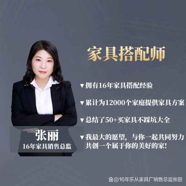 我是张丽,一位16年乐从家具厂销售总监,累计服务过12000个客户,关注我,让你花更少的钱,买更好的家具!