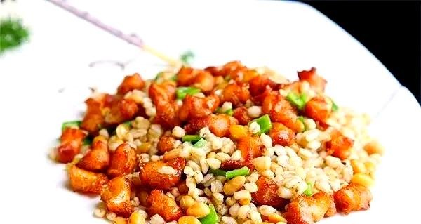 烹饪过程中,先起锅烧油,将虾仁过油处理。接着,将洋葱粒、芹菜粒、葱白粒、红黄椒粒等辅料加入锅中,加盐爆香备用。随后,加入鸡蛋黄和糯米腊肠粒翻炒至散,调味时使用东古酱油、盐、鸡精和黑松露酱。最后,加入备用料炒出锅气,出锅前撒上炸米,即可装盘上菜。