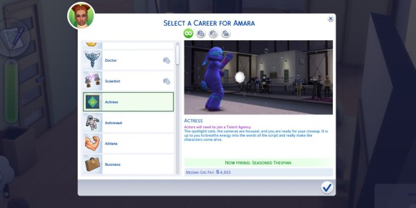 演艺生涯是一项活跃的工作,因此玩家可以跟随他们的模拟市民工作并度过工作日。要加入演艺事业,西姆斯可以使用手机或屏幕右下角的工作面板来寻找工作。然后,,西姆斯在确认工作后与代理机构签约,并可以选择工作。