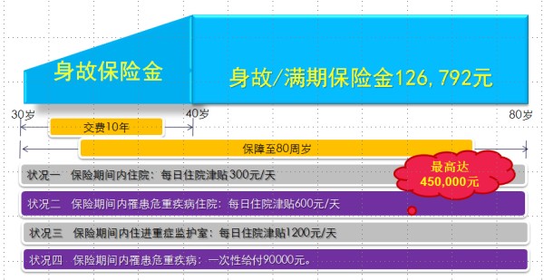 无论在保险期间,住院日额赔付多少,80岁期满生存可领取【满期保险金】,满期保险金=主附险已交保险费×120%,为您精打细算,不浪费每一分钱。