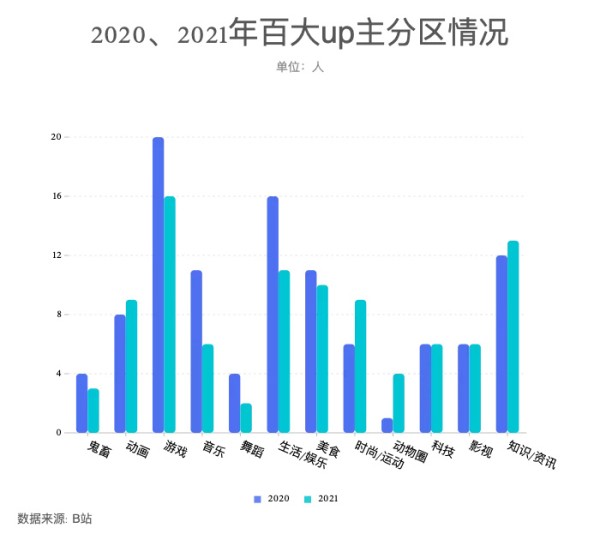 可以看到,这几个分区仍是获得百大up荣誉的集中区域。2021年,游戏、知识资讯、生活娱乐、音乐、美食