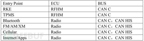 2014 Jeep Cherokee的车内架构非常简单,如图2所示,而最为关键的一点是Radio直接与车内的两个CAN总线相连,CAN-C和CAN IHS,而CAN-C则是直接连到车内的动力系统中,比如发动机控制、变速箱换挡控制、ABS制动、电子手刹等子系统。那么这样的电子电气架构就意味着,只要侵入了汽车的Radio系统,就能够实现远程控制汽车。如表1所示,列出了Jeep Cherokee可能的入侵点。