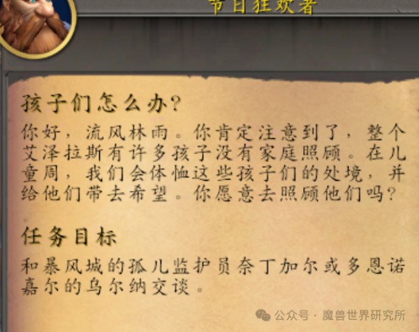 玩家可以通过卡兹·阿加的乌尔纳接取任务,帮助这些孤儿完成他们的冒险,并带领他们见识艾泽拉斯的精彩。今年的任务线从多恩诺嘉尔商栈旁的节日狂欢者开始,接到任务“孩子们怎么办”后