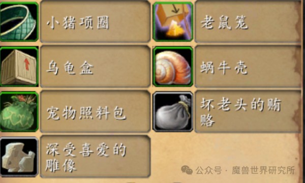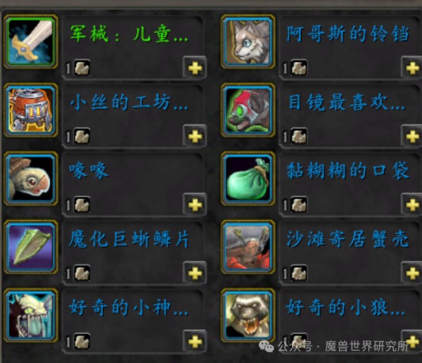 儿童的暴风城卫兵武器套装儿童的奥格瑞玛卫兵武器套装这些宠物和幻化物品都可以通过深受喜爱的雕像兑换获得,往年的宠物只有蜗牛滑滑和长腿是任务线限定宠物。你可以根据自己喜好选择不同的任务线来获取这些宠物。以下是任务线的宠物选择与获取方法:主城任务线(暴风城56.54,奥格58.57) 可选宠物:蜗牛滑滑、扭扭先生、小老鼠吱吱、飞毛腿沙塔斯(75.48) 可选宠物:长腿、蛋蛋、小新、威利晶歌森林达拉然(48.63) 可选宠物:好奇的小神谕者、好奇的小狼獾人伯拉勒斯(48.40)/达萨罗(54.84) 可选宠物:跳跳蛙、喙喙、阿鳞、蟹蟹先生多恩诺嘉尔(55.27) 可选宠物:阿哥斯、实用的工坊机器人、目镜,以及两套新幻化。如果你已经拥有上述宠物,完成任务后你将获得宠物照料包作为替代奖励,其中包含丰富的宠物相关道具。