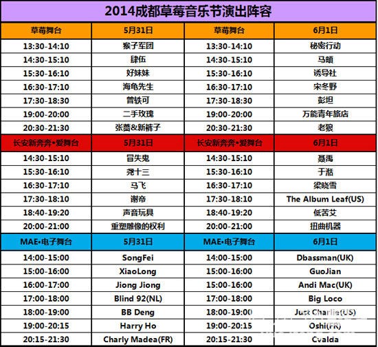 首届成都草莓音乐节为期两天,将设“草莓”、“长安新奔奔•爱”、“MAE•电子”三个舞台,演出阵容强大,共邀请40组国内外各类艺人/乐队参演。复古Disco女王张蔷携新裤子乐队加盟,压轴首日草莓舞台,第二天压轴艺人则是老牌民谣歌手老狼,国粹摇滚二手玫瑰与新晋签约摩登天空的万能青年旅店乐队,以及重塑雕像的权利、扭曲机器、海龟先生、彭坦、诱导社、低苦艾等国内大牌摇滚乐队都将参演,宋冬野、曾轶可、梁晓雪以及民谣组合好妹妹将为首届成都草莓增添更多文艺气质,而成都本土乐队声音玩具、秘密行动也将登陆草莓带来属于成都本土的声音。此外,以一曲《老子今天不上班》火遍全国的谢帝,以及摇滚快男于湉也将现场带来自己的原创作品。