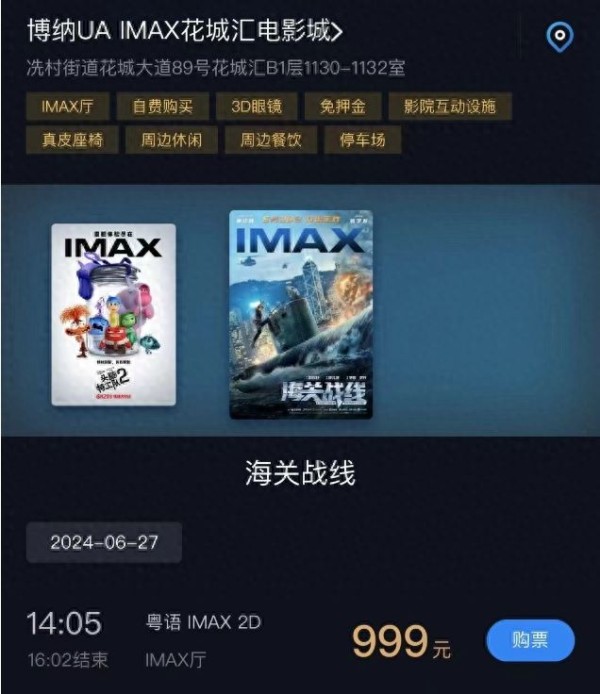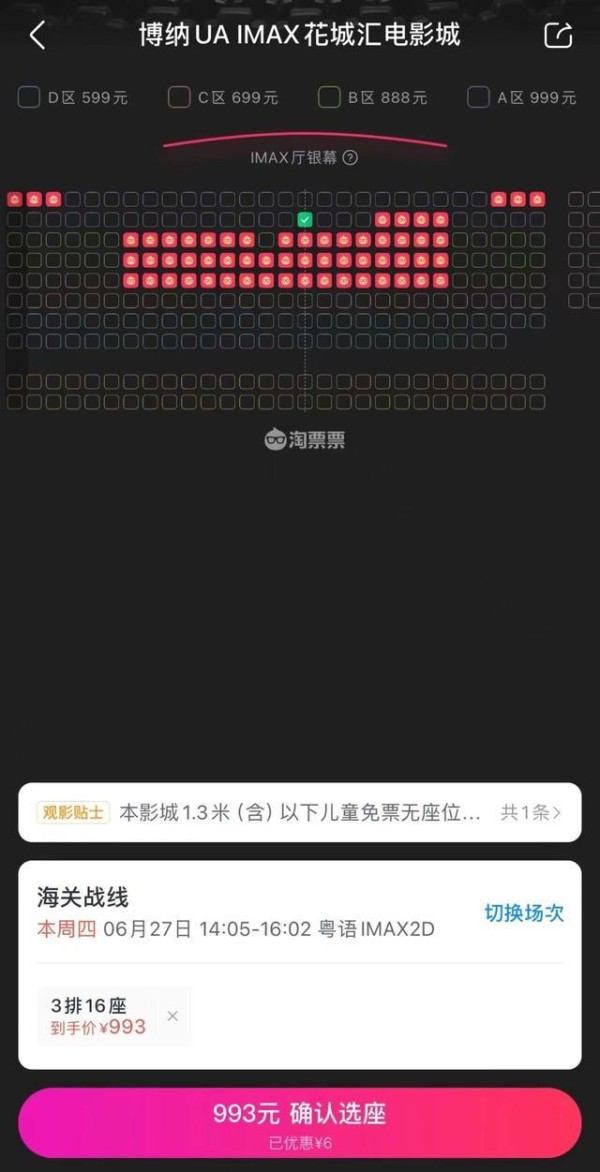 前段时间谢霆锋主演的电影《海关战线》在广州的路演场票价,就引发了不小的讨论。影城将观影区域划分为四个区,最前排的A区价格甚至达到了999元,B区888元、C区699元、D区599元。