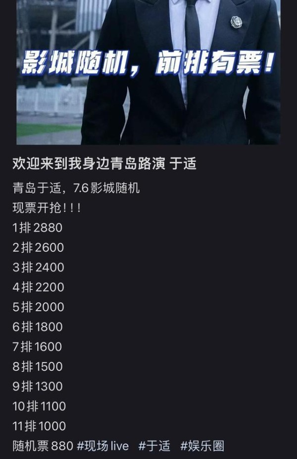 以日前上映的电影《欢迎来到我身边》为例,片中主演于适等主创现身的映后交流,自然也吸引了不少影迷及粉丝的关注。记者注意到,该片青岛路演场部分影院分区售票,其中票价最高的区域价格为999元到1599元不等。在社交平台上有用户发文售票:“青岛于适,7.6影城随机,现票开抢,1排2880、2排2600……”除此之外,在二手平台上该电影路演场1排,也被直接标价为2000元。