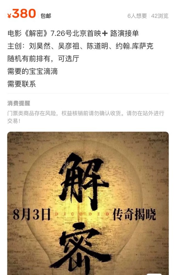 除了这部电影,二手平台上,由陈思诚执导,刘昊然、吴彦祖等主演的电影《解密》首映礼和路演场次也已开启预售。记者被告知首映礼前3排位置,售价为500元,在另一家咨询时,了解到路演场次前3排售价为600元。