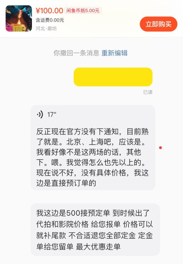 记者咨询时卖家告知:“现在官方没有下通知,(价格)现在说不好,没有具体价格,我这边是直接预订单的。我这边是500接预订单,到时候除了代拍和影院价格,给您报单,价格可以就补尾款,不合适就给您退全部定金,定金单给您留单,最大优惠走单。”