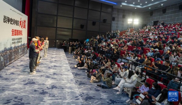 10月19日,在北京市中国电影博物馆举行的电影《大突围》全国首映礼上,主创人员与观众交流。