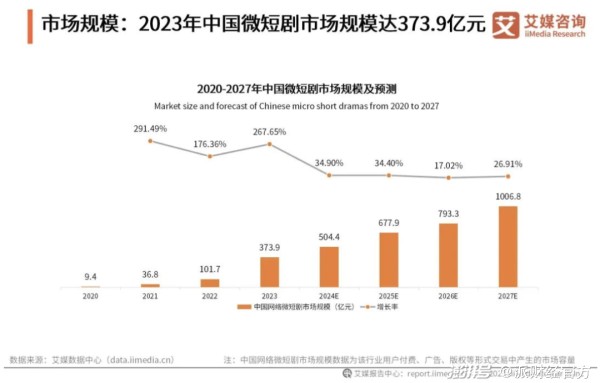 据艾媒咨询《2023-2024年中国微短剧市场研究报告》显示,2023年中国网络微短剧市场规模为373.9亿元,同比增长267.65%,光是2023年第三季度中国网络微短剧发行量达150部,接近2022年全年总和的2倍。2027年中国网络微短剧市场规模将超1000亿元。